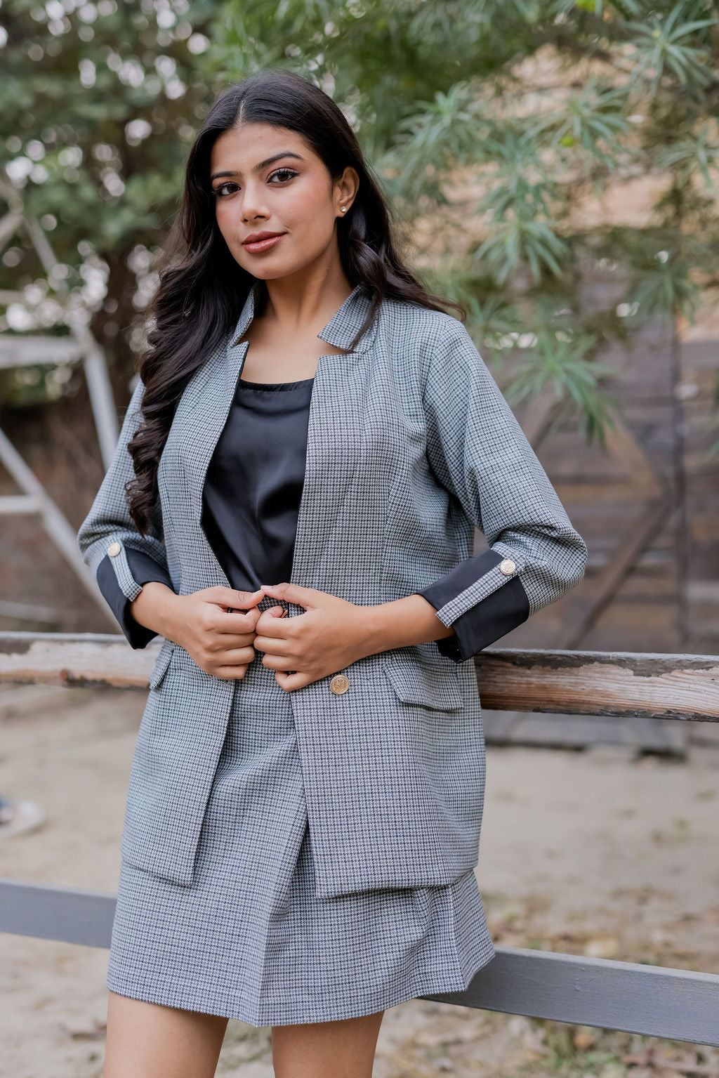 Black and grey woollen houndstooth coat & Pants Co ord set with black satin detailing and gold buttons