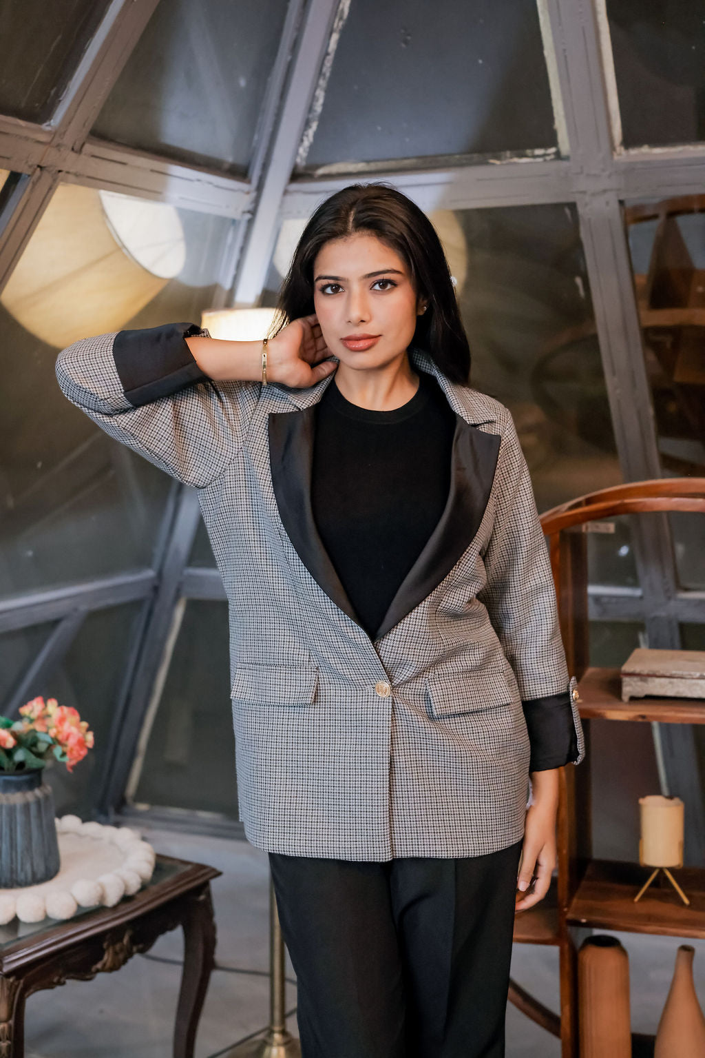 Step into elevated winter sophistication with our Black & Grey Woollen Houndstooth Coat & Pants Co-ord Set, crafted from premium wool-blend fabric for warmth, structure, and timeless elegance. The classic black and grey houndstooth pattern is enhanced with sleek black satin detailing, adding a refined contrast that elevates the entire silhouette. Finished with signature gold buttons, this co-ord set brings together luxury, comfort, and modern charm—perfect for winter outings, formal events, and power-dressing moments.