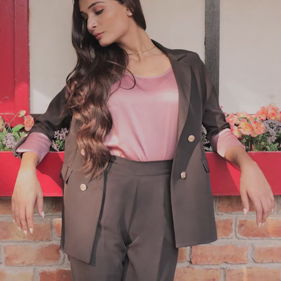 Add a touch of sophistication to your wardrobe with our Black Crepe Coat, elevated with peach satin cuff detailing and statement gold buttons. Crafted from premium crepe fabric, this coat combines sleek tailoring with subtle feminine charm. The classic black hue makes it a timeless staple, while the satin accents introduce a refined contrast — perfect for those who appreciate understated luxury and modern elegance.