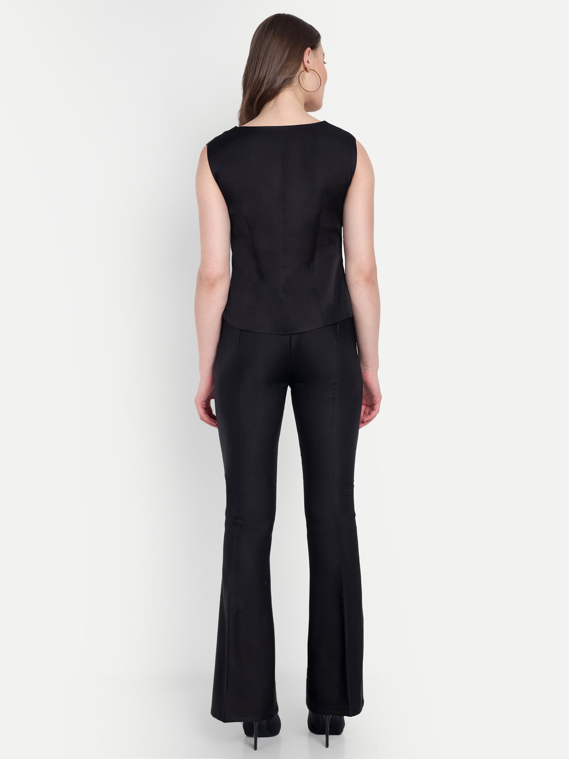 For a sophisticated office look, pair this black linen waistcoat with a white blouse, high-waisted trousers, and heeled sandals or boots. Keep accessories minimal to let the gold appliqué shine.