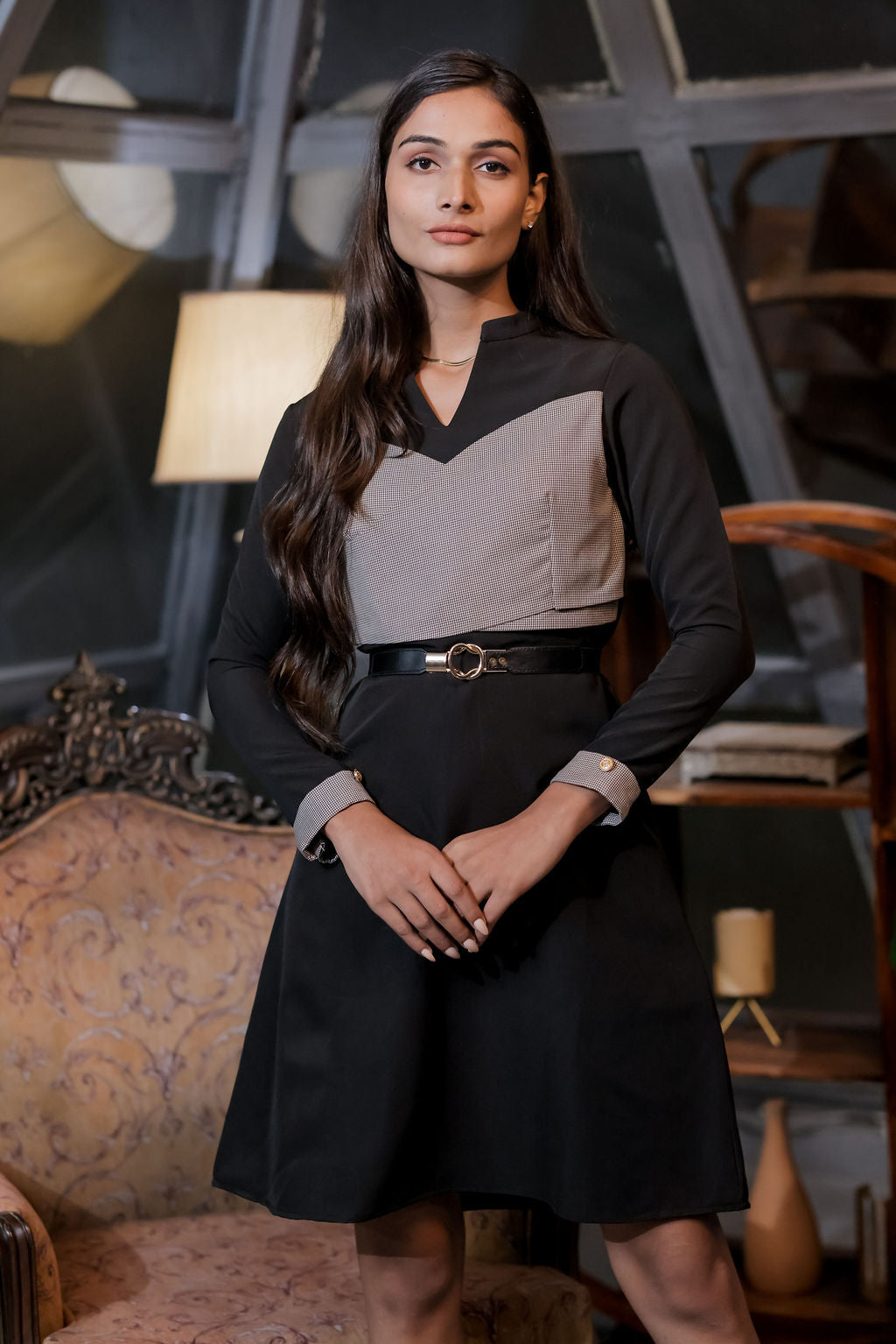 Turn heads with our Black Dress featuring a striking Houndstooth Wrap on the Bust — a perfect blend of classic sophistication and modern charm. Crafted from premium stretch fabric, this dress offers a flattering, sculpted fit that enhances your natural curves while ensuring all-day comfort. The contrast houndstooth wrap adds a bold, stylish accent to the timeless black silhouette, making it ideal for parties, dinners, work events, or chic day-to-night transitions. Elegant, versatile, and statement-worthy, this dress is a must-have addition to your contemporary wardrobe.