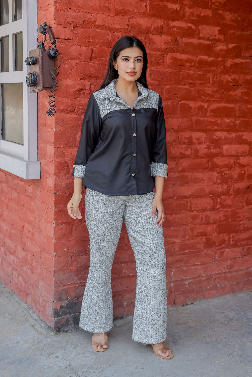 Black & grey tweed shirt with Black and grey houndstooth pants with gold buttons detailing Co ord set ESWSH0020-BLKGB