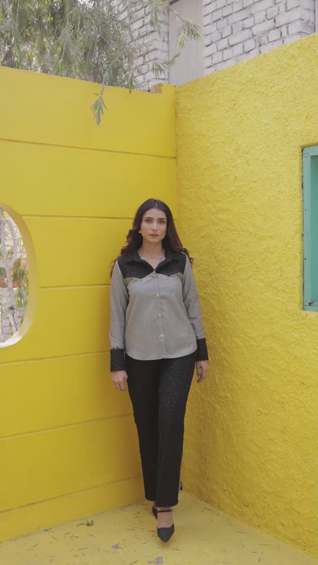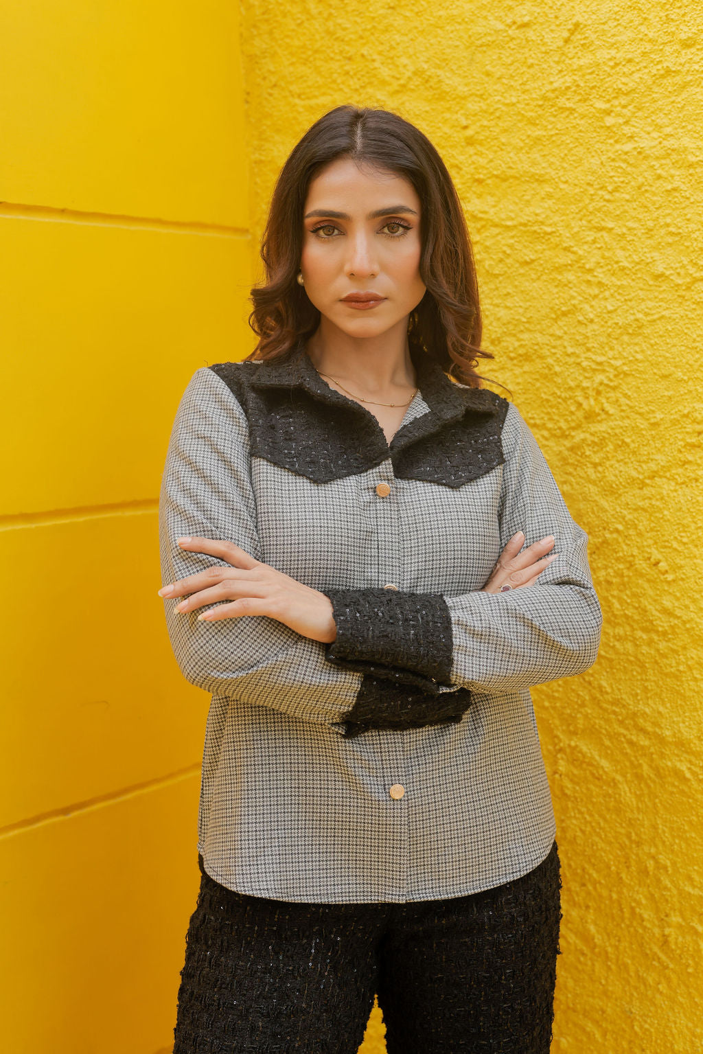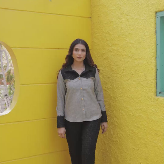 A perfect blend of classic and contemporary — this Black Tweed Shirt with Houndstooth Fabric brings winter luxury to everyday style. Designed with premium black tweed and contrasted with a sophisticated houndstooth pattern, this piece balances texture, depth and elegance in one stunning silhouette.