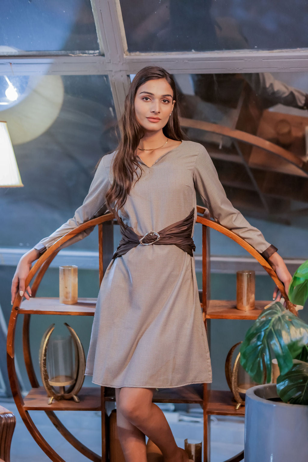 Step into timeless sophistication with our Brown Houndstooth Dress, perfectly accented with a luxurious brown satin belt featuring a statement gold buckle. Crafted from premium woven fabric, this dress showcases the classic houndstooth pattern in rich brown tones, offering a refined and structured silhouette. The satin belt cinches the waist beautifully, adding a touch of elegance and enhancing your natural shape. Perfect for office events, brunches, semi-formal gatherings, or day-to-night dressing, this dress blends heritage charm with modern styling.