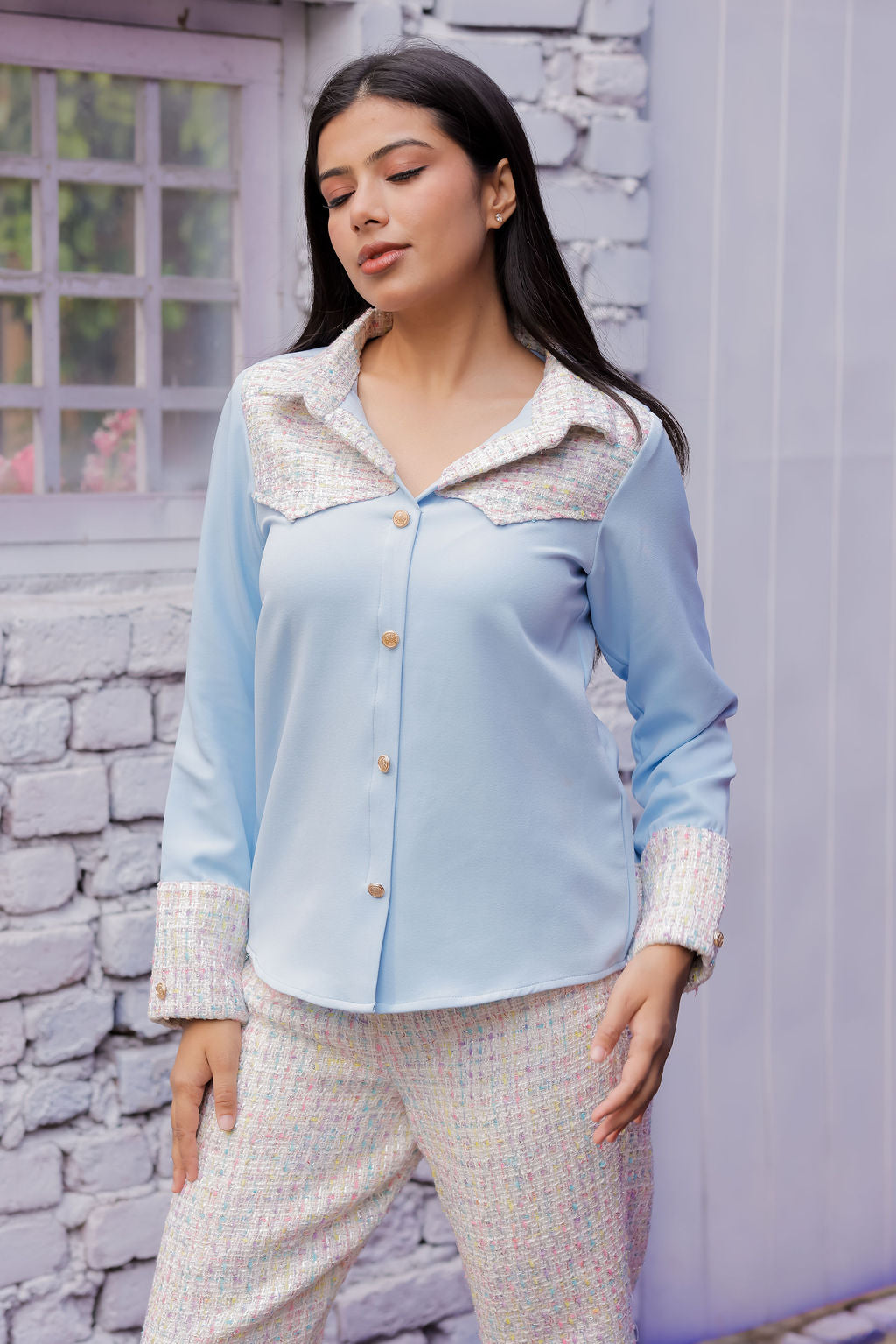 Colourful tweed Blue shirt with pants with gold buttons detailing Co Ord Set ESWSH0024-CLRGB