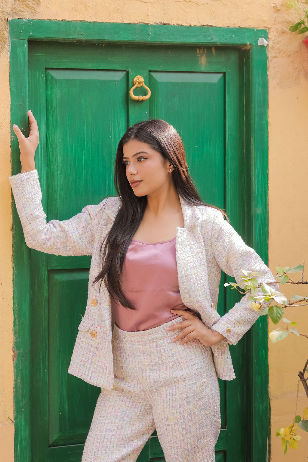 Pair it with a solid-coloured inner and trousers to let the tweed shine during the day, or elevate it with gold accessories and heels for a statement evening ensemble.