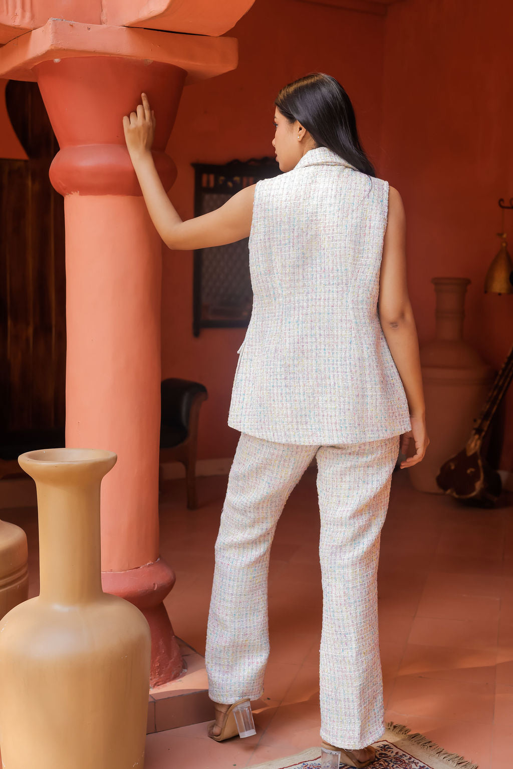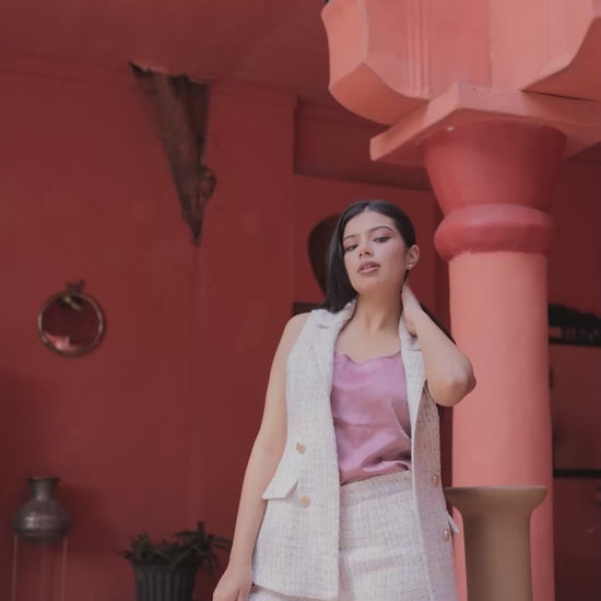 Elevate your ensemble with our Colourful Tweed Waistcoat, featuring elegant gold button detailing for a touch of refined sophistication. Crafted from premium textured tweed, this waistcoat offers a structured, tailored fit that flatters Indian body types while adding a vibrant, stylish accent to your outfit. The playful mix of colours brings a contemporary twist to classic tailoring, making it perfect for office styling, brunches, casual chic layering, or semi-formal gatherings.