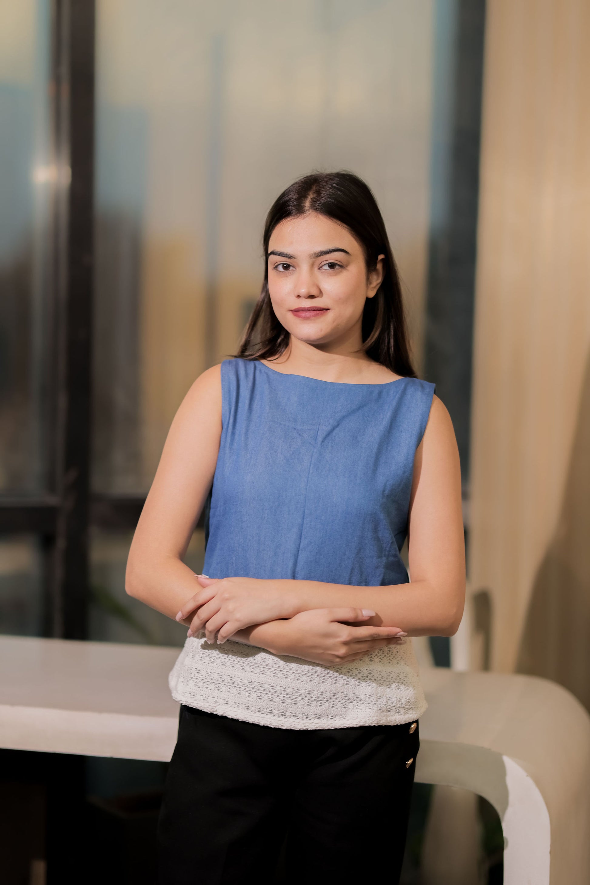 Play up modern chic with our Blue Denim and White Crochet Sleeveless Top, finished with a striking gold buckle. The contrast of structured denim and delicate crochet creates a perfect balance of edgy and feminine, while the luxe buckle detail adds a bold touch. A versatile piece that transitions effortlessly from brunch dates to evening outings.