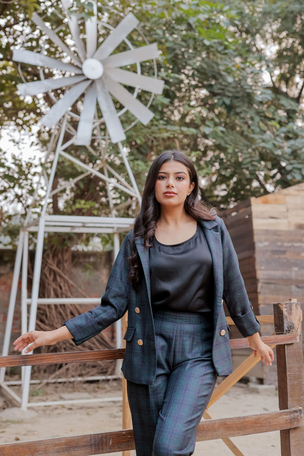 Structured coat paired with tailored straight-fit pants that flatter Indian body types