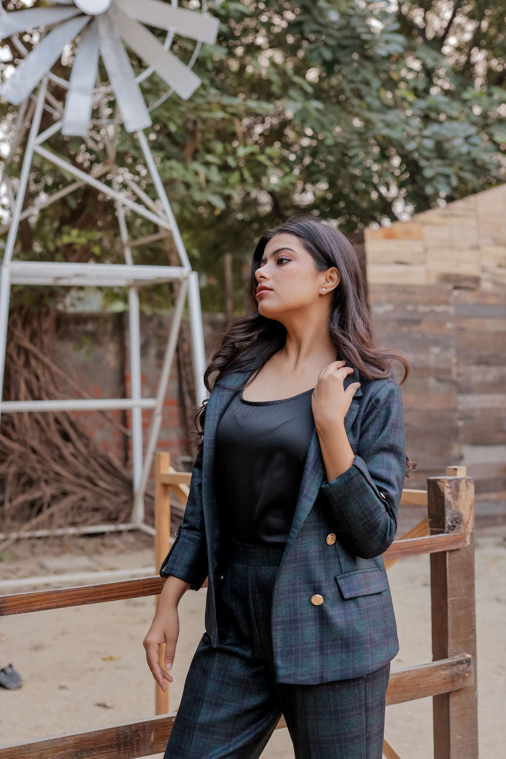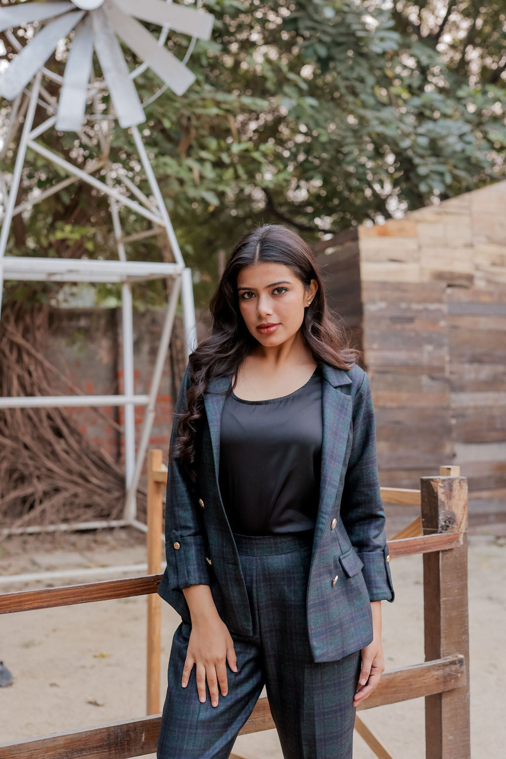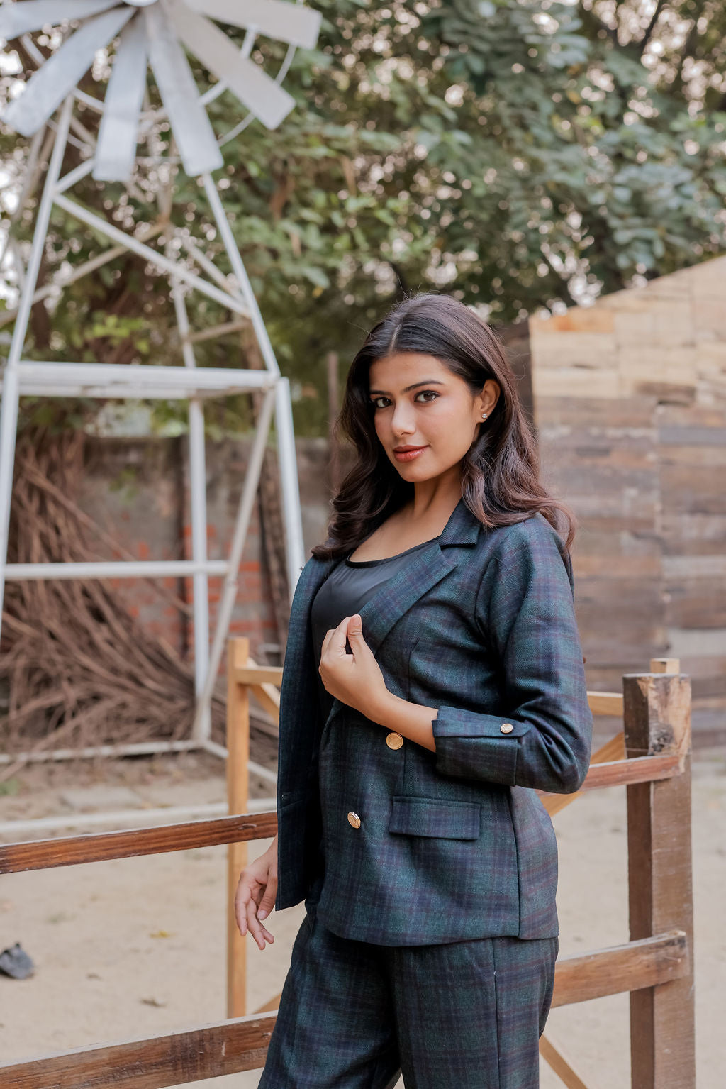 Green & Blue tweed fabric coat with gold buttons detailing & Pants Co ord set EWCO0037-GRNPT