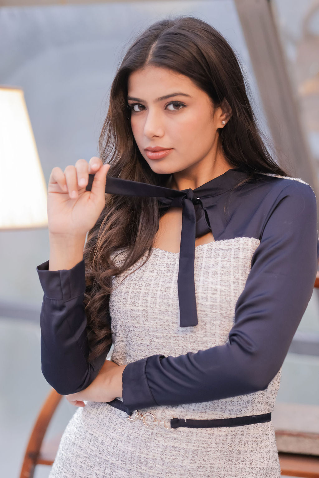 This Grey & Black Tweed Dress features a beautiful blend of winter tweed with striking dark blue sleeve detailing, giving the silhouette structure while adding a touch of contemporary style. Designed to make cold-season outfits look polished without compromising comfort.