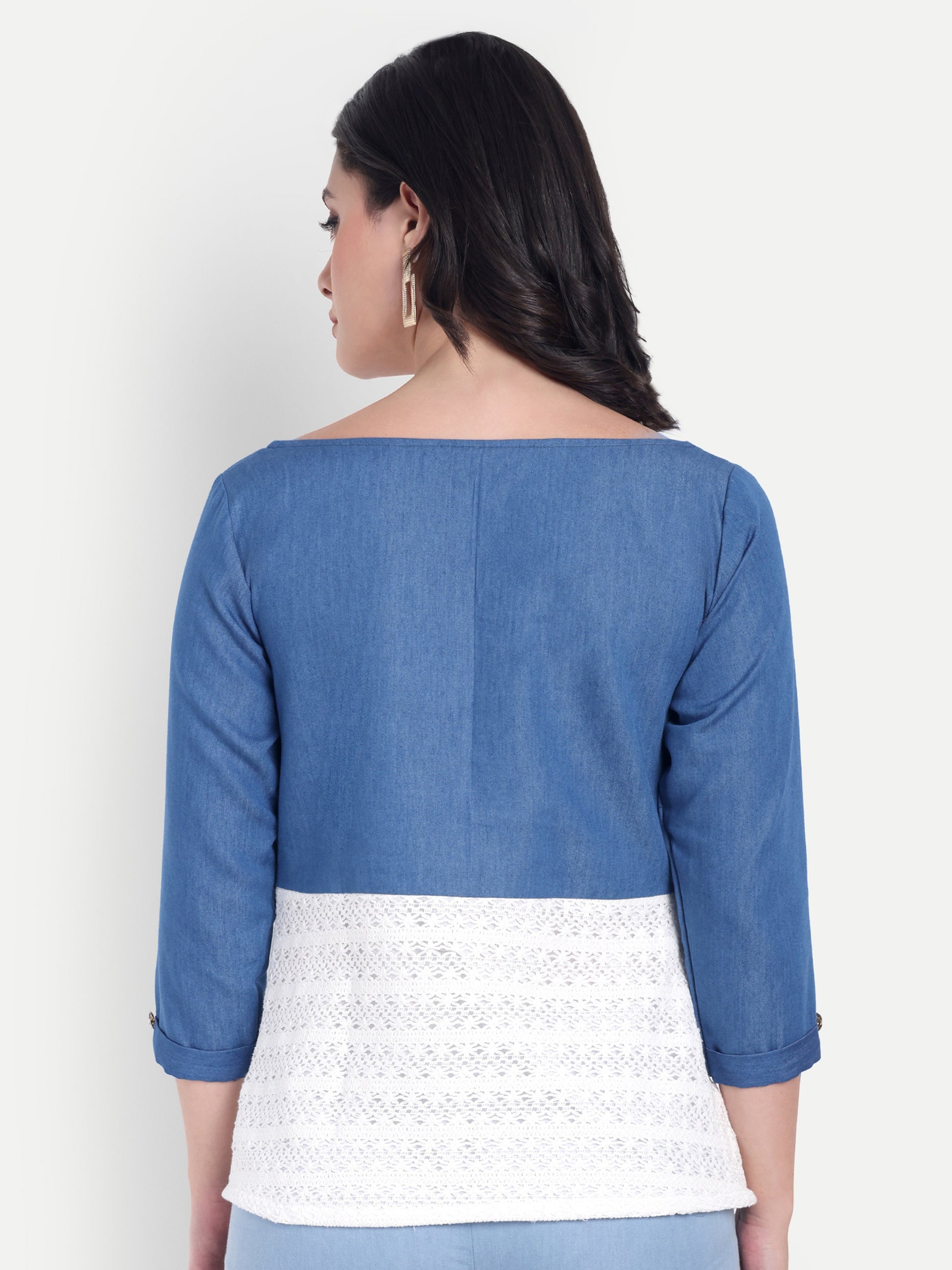 Blue denim top and white crotia cowl top with sleeves EWTP0030-BLUTC