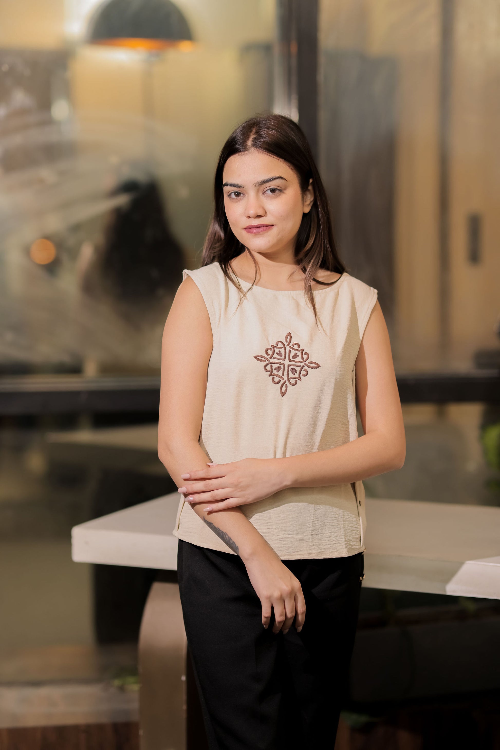 Cream linen with brown embroidery top EWTP0037-CREEB
