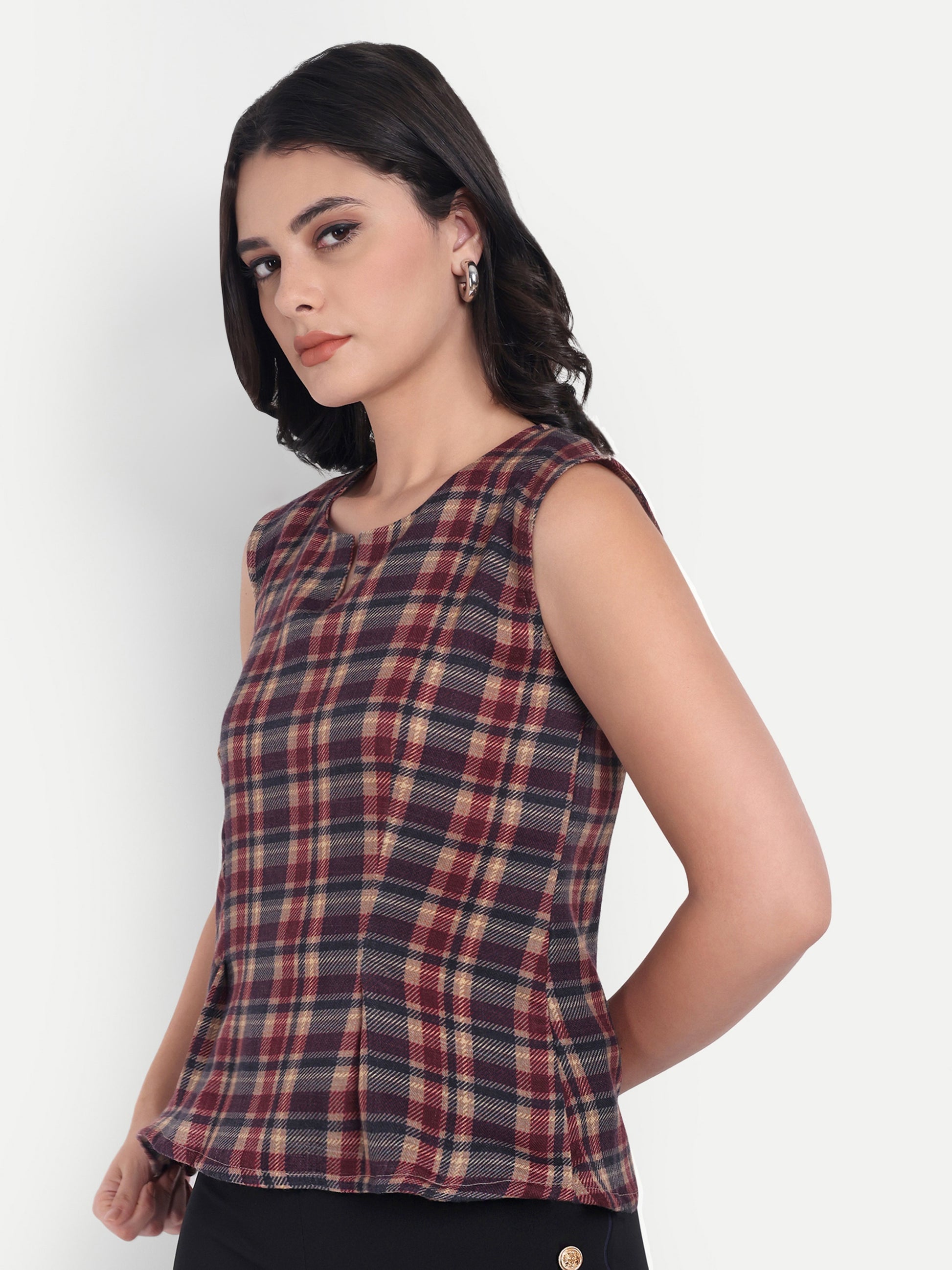 Make a timeless statement with this maroon check peplum top—a perfect blend of classic charm and modern flair. Featuring a structured waist and flared hemline, this top is designed to accentuate your natural silhouette while offering all-day comfort. The checkered pattern adds a playful yet polished touch, making it a versatile choice for both casual outings and semi-formal settings.
