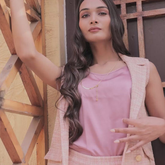 Elevate your ensemble with our Peach Tweed Waistcoat with Gold Buttons, featuring elegant gold button detailing for a touch of refined sophistication. Crafted from premium textured peach tweed, this waistcoat offers a structured, tailored fit that flatters Indian body types while adding a soft, vibrant accent to your outfit. The warm peach hue brings a contemporary twist to classic tailoring, making it perfect for office styling, brunches, casual chic layering, or semi-formal gatherings.