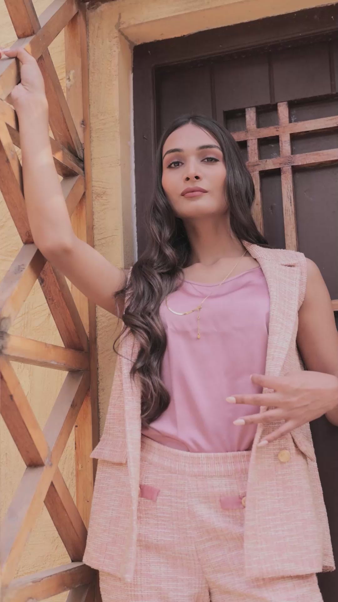 Layer it over a crisp white shirt or satin blouse and pair with tailored trousers or a skirt for a polished look. Add minimal gold jewelry and neutral heels to highlight the buttons and soft peach tones.