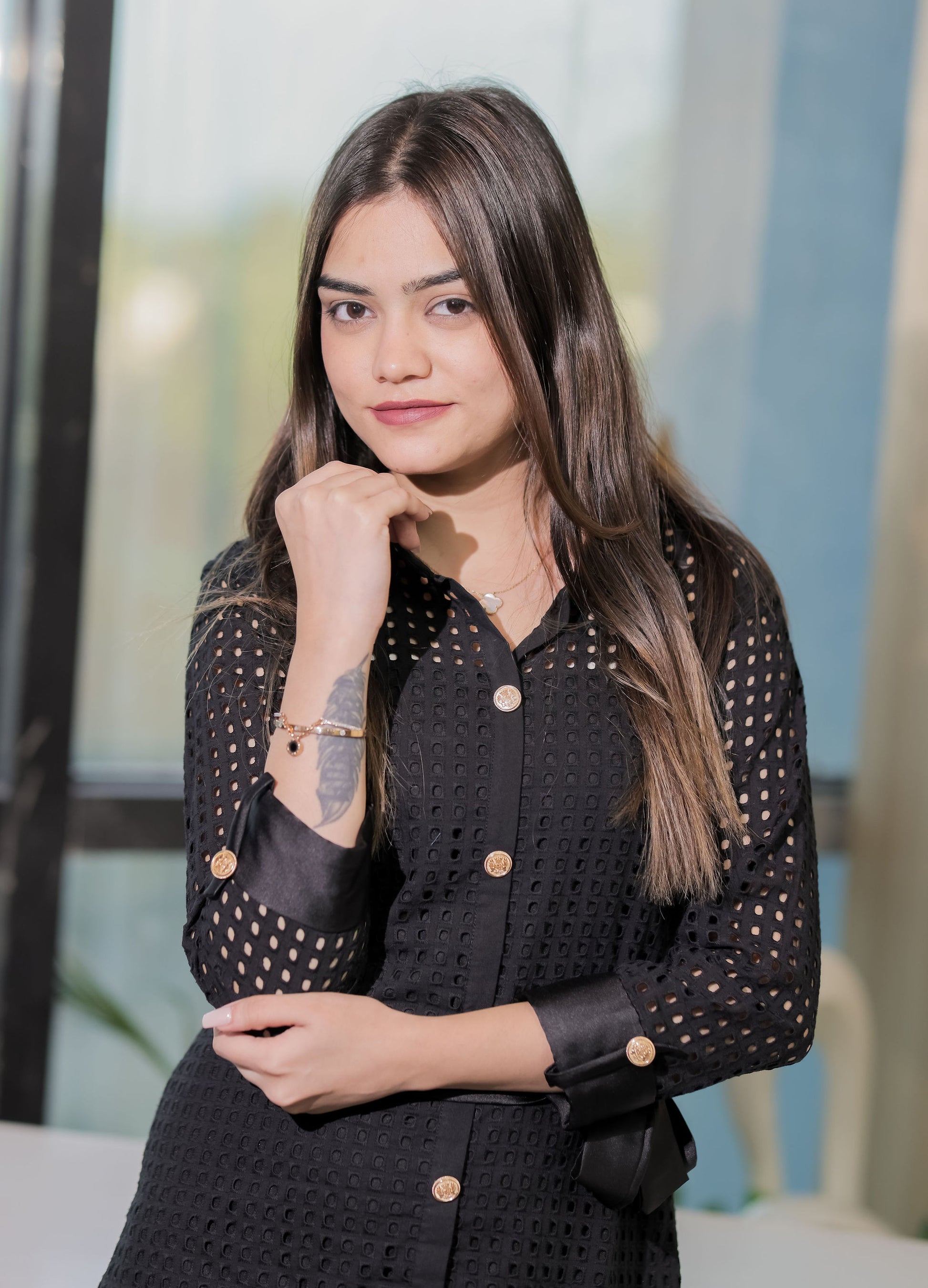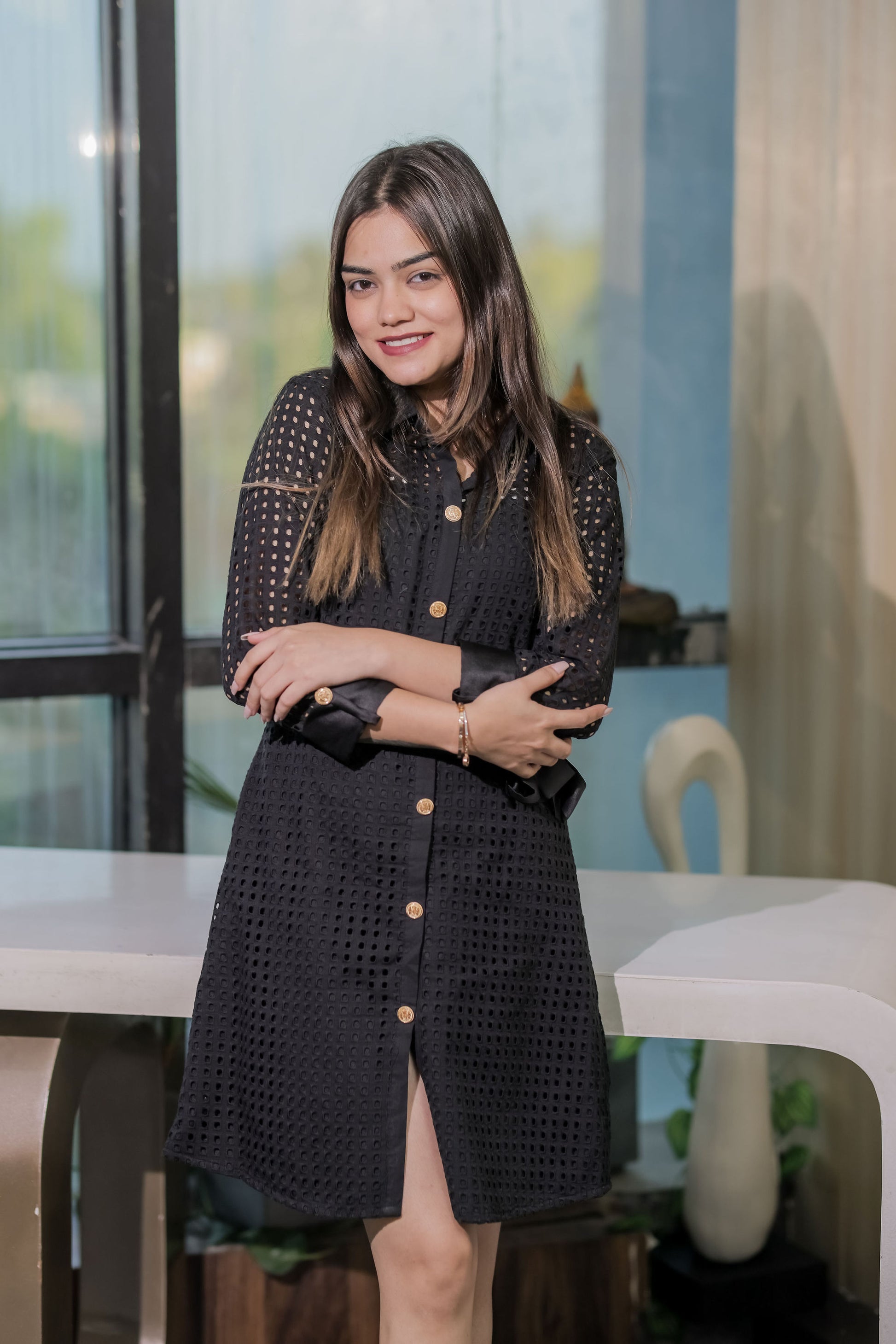Redefine elegance with our Black Square Cutwork Dress — a timeless sleeveless design crafted in intricate cutwork fabric. The geometric pattern adds a modern edge, while the classic black hue ensures versatile styling from day to night. Effortlessly chic, this dress is a statement of sophistication.