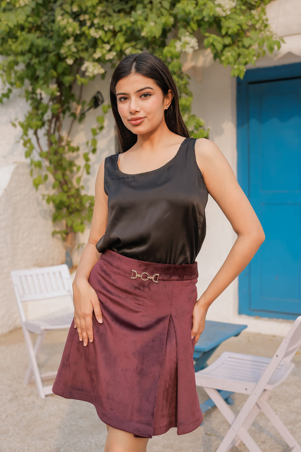 Structured velvet coat paired with a coordinated skirt designed to flatter Indian body types