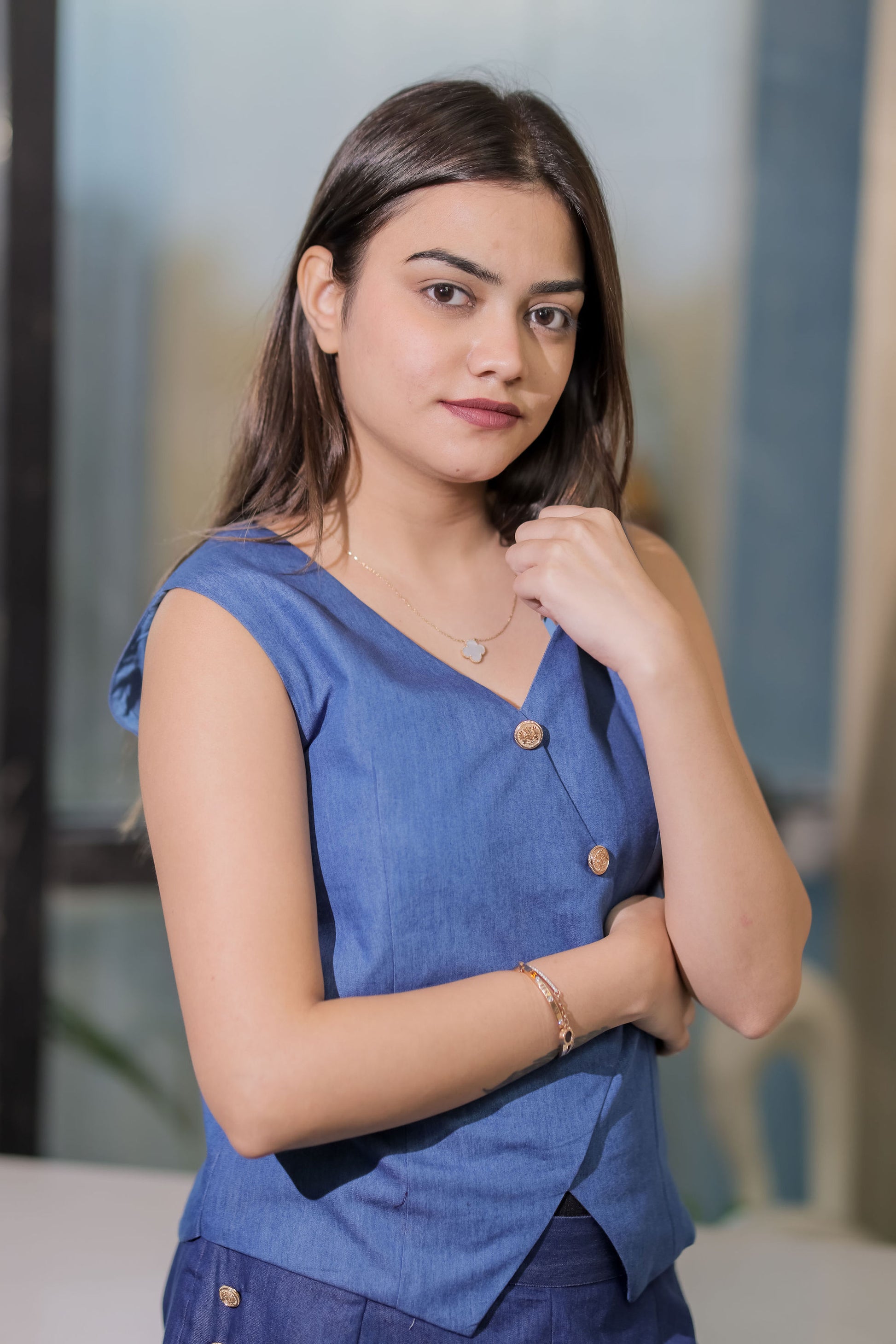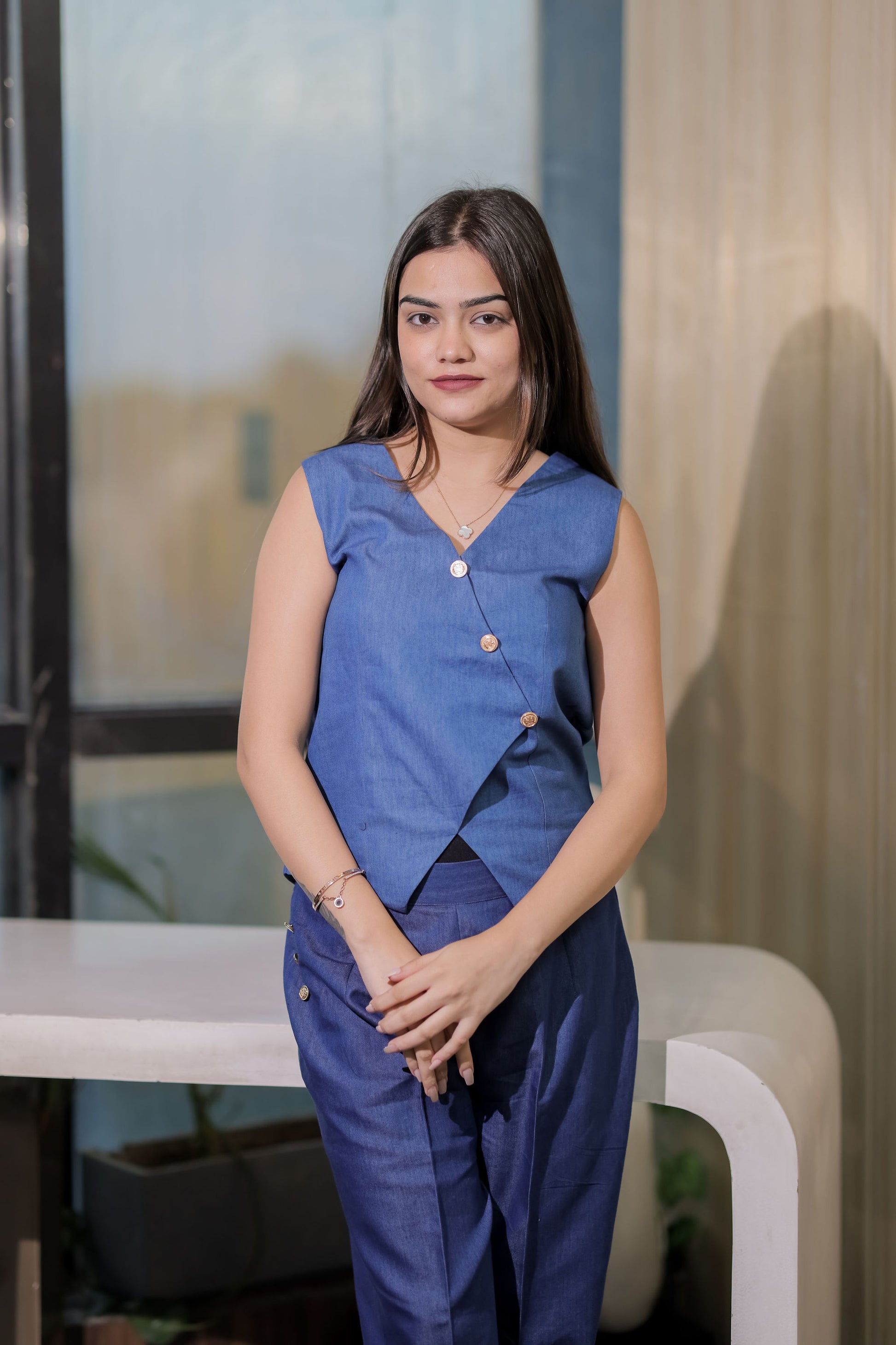 This mid-blue denim waistcoat with gold buttons effortlessly combines rugged charm with refined elegance. Made from high-quality denim, it features a rich blue tone that’s both versatile and timeless. The gold buttons provide a striking contrast, lending the piece an element of sophistication that elevates its casual look. With its structured, tailored cut, this waistcoat offers a flattering silhouette that can be dressed up or down. Perfect for layering over a shirt or paired with a matching denim jacket for a coordinated ensemble, it adds a modern twist to any outfit. Whether you’re going for a relaxed day look or an elevated evening vibe, this denim waistcoat is a versatile addition to any wardrobe.