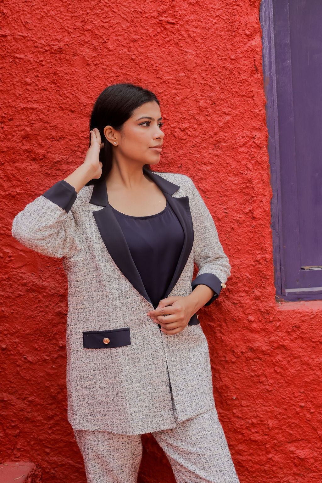 Structured coat paired with tailored straight-fit pants designed to flatter Indian body types
