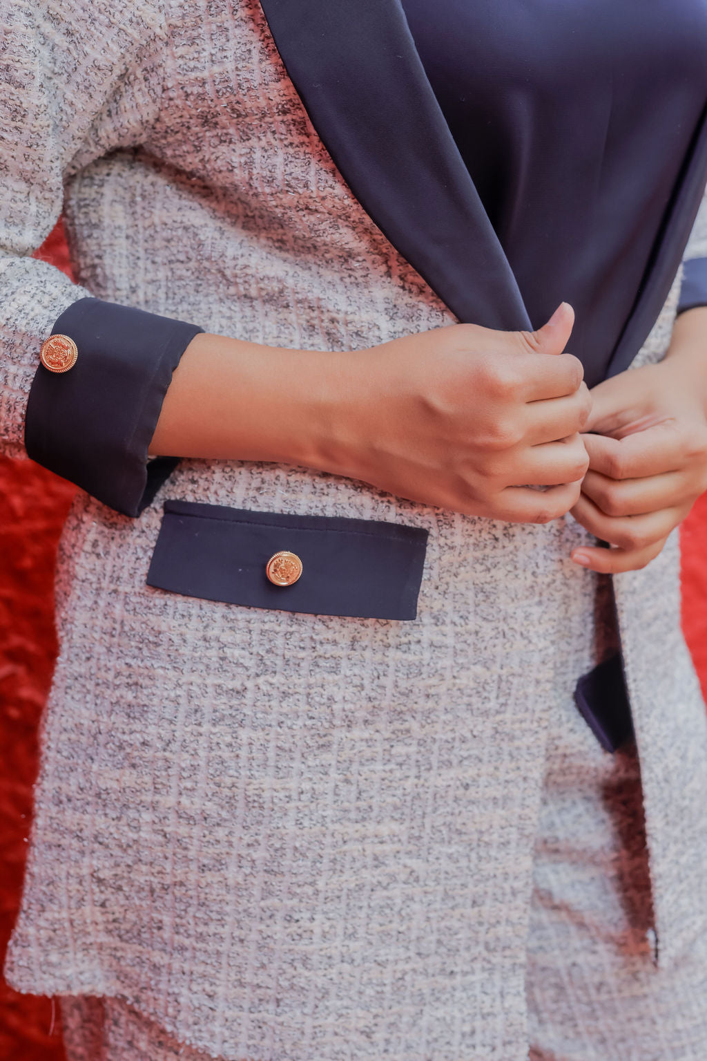 Step into refined elegance with our White & Grey Tweed Coat & Pants Co-ord Set, crafted from premium multi-toned tweed fabric for a sophisticated, textured finish. The soft white and grey palette is beautifully elevated with rich blue satin detailing, adding a modern pop of contrast that enhances the luxurious appeal. Finished with signature gold buttons, this co-ord set blends timeless charm with contemporary detailing—perfect for formal events, office wear, winter outings, or elevated day-to-evening styling.