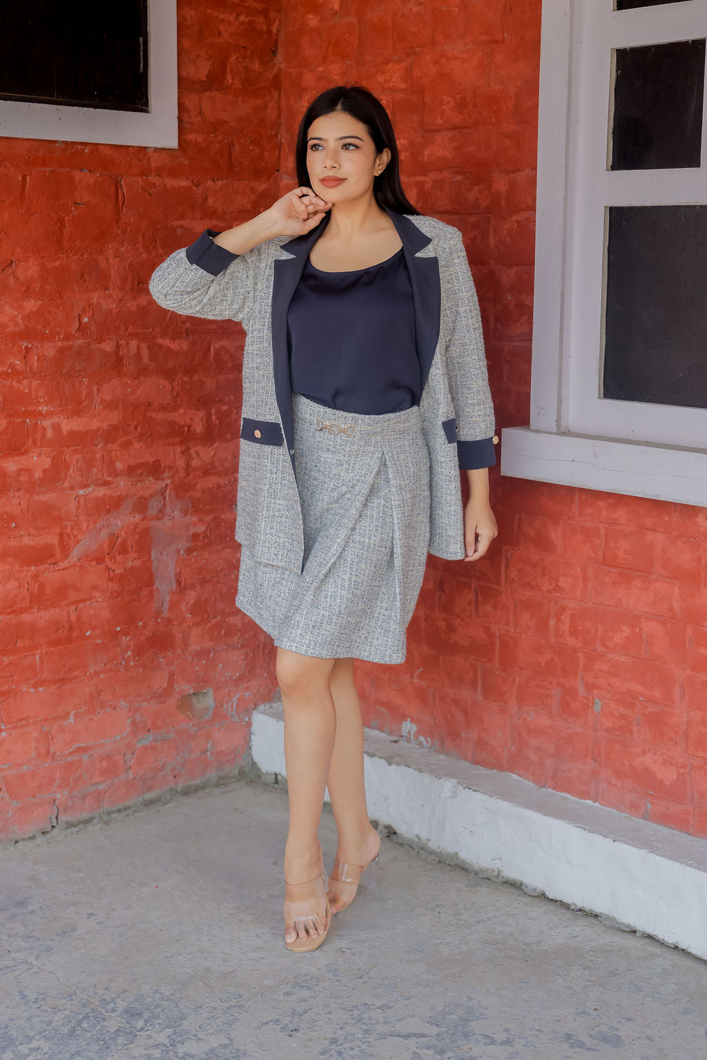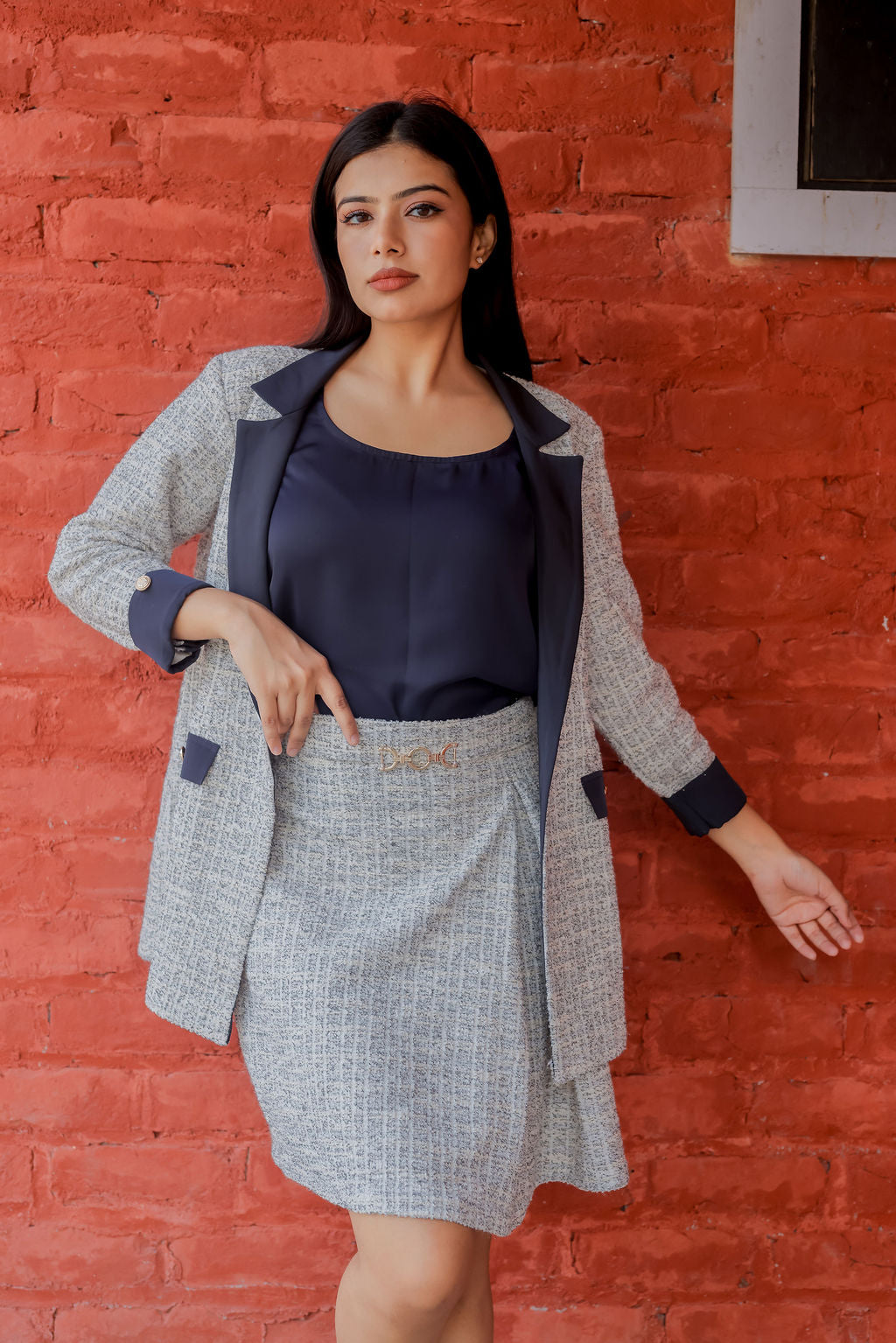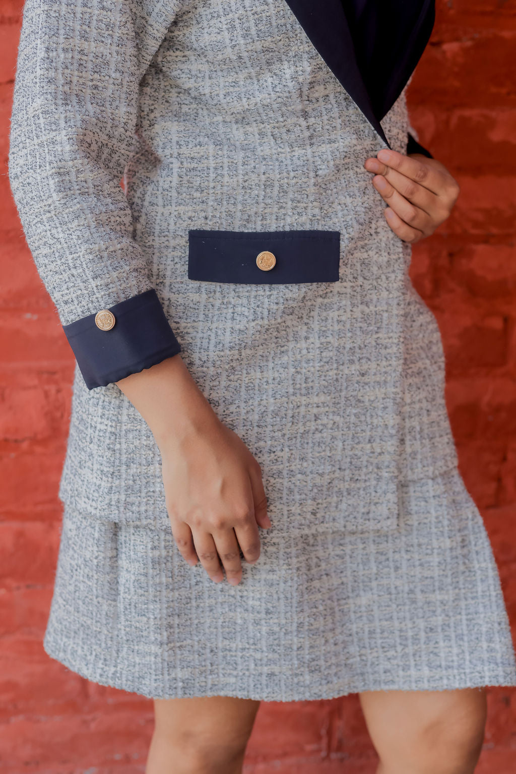 Step into timeless elegance with our White & Grey Tweed Coat, crafted in luxurious tweed fabric that exudes sophistication and charm. The coat features refined blue satin detailing and statement gold buttons, striking the perfect balance between classic texture and modern accents. Designed for both structure and comfort, this piece effortlessly elevates any outfit — making it an ideal choice for refined daywear or chic evening looks.