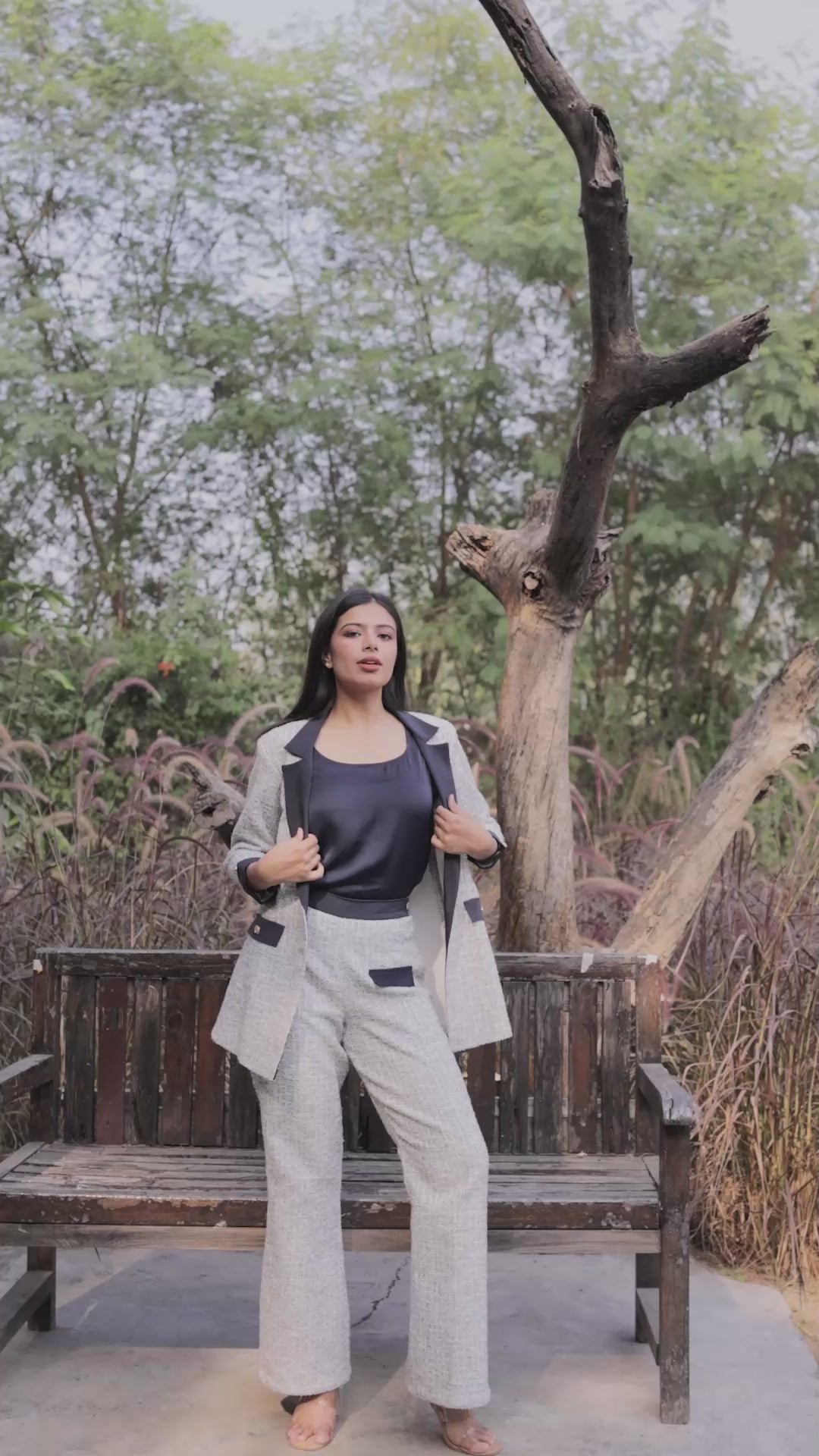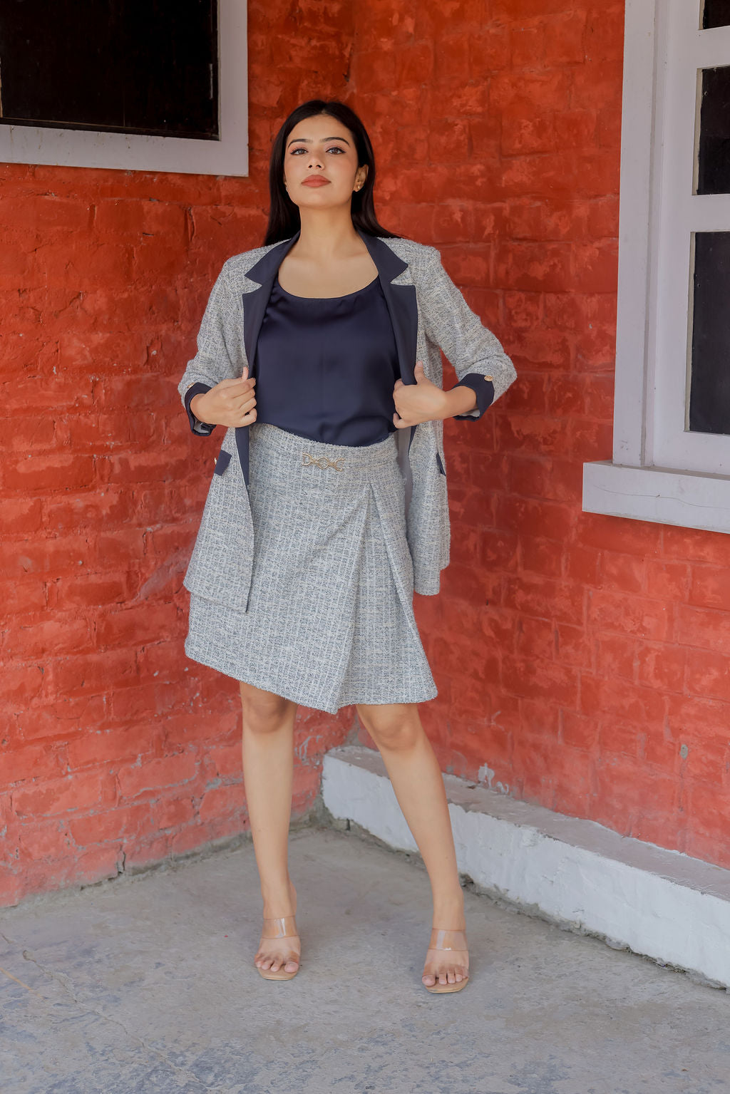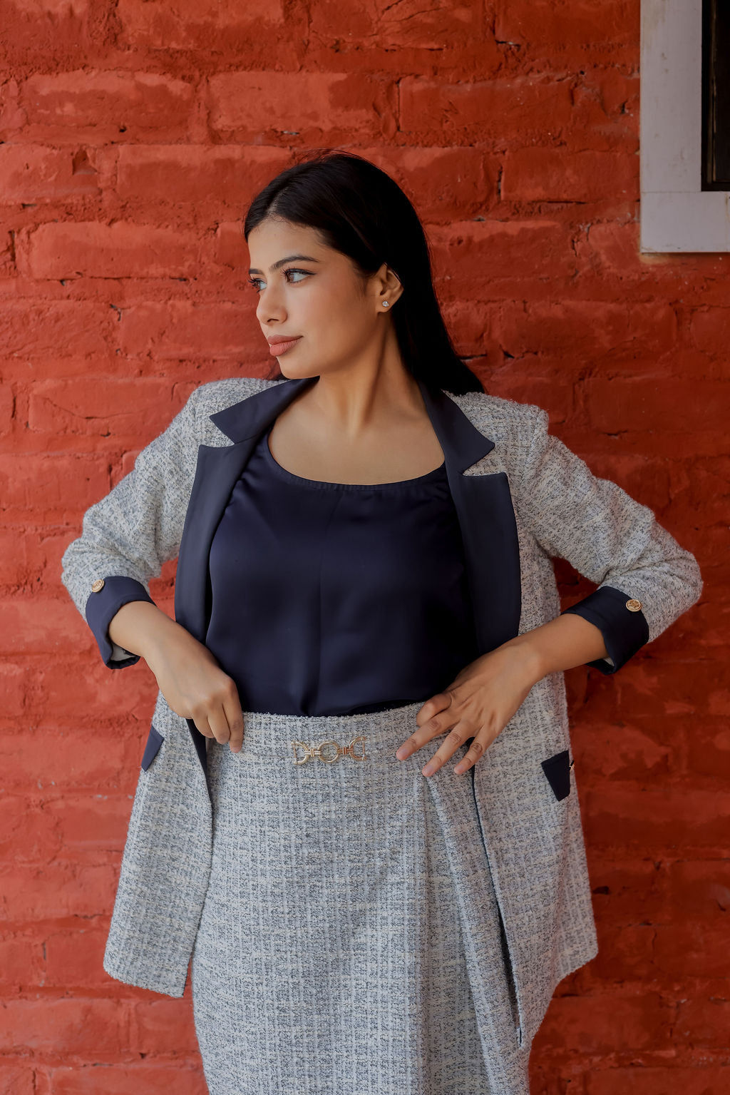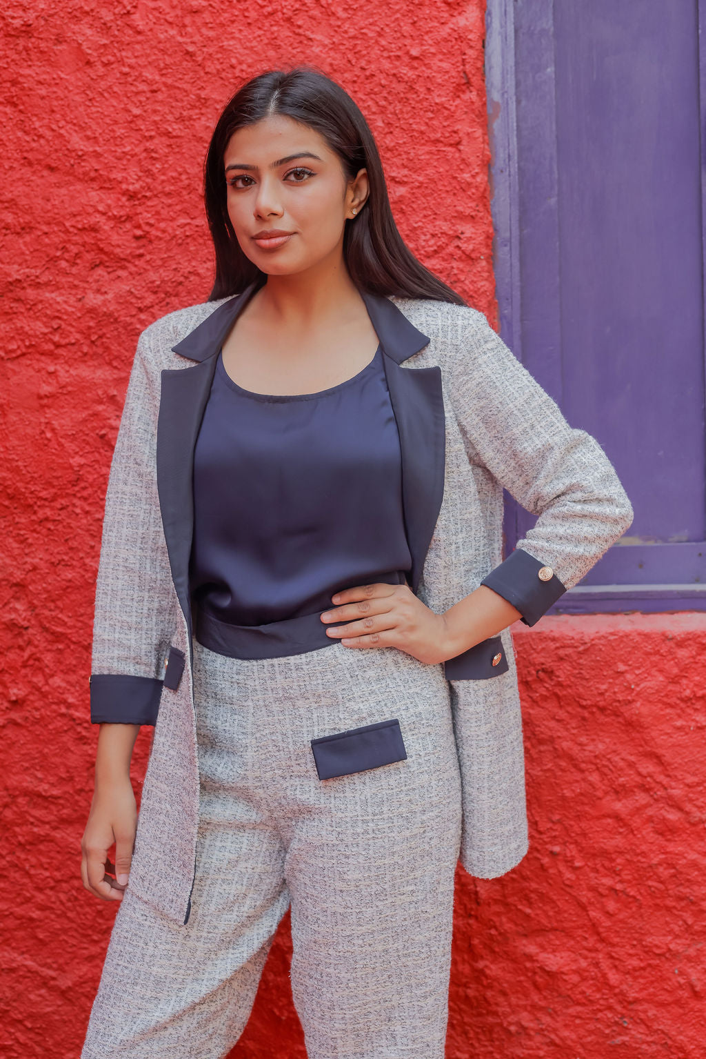 Step into timeless elegance with our White & Grey Tweed Coat, crafted in luxurious tweed fabric that exudes sophistication and charm. The coat features refined blue satin detailing and statement gold buttons, striking the perfect balance between classic texture and modern accents. Designed for both structure and comfort, this piece effortlessly elevates any outfit — making it an ideal choice for refined daywear or chic evening looks.