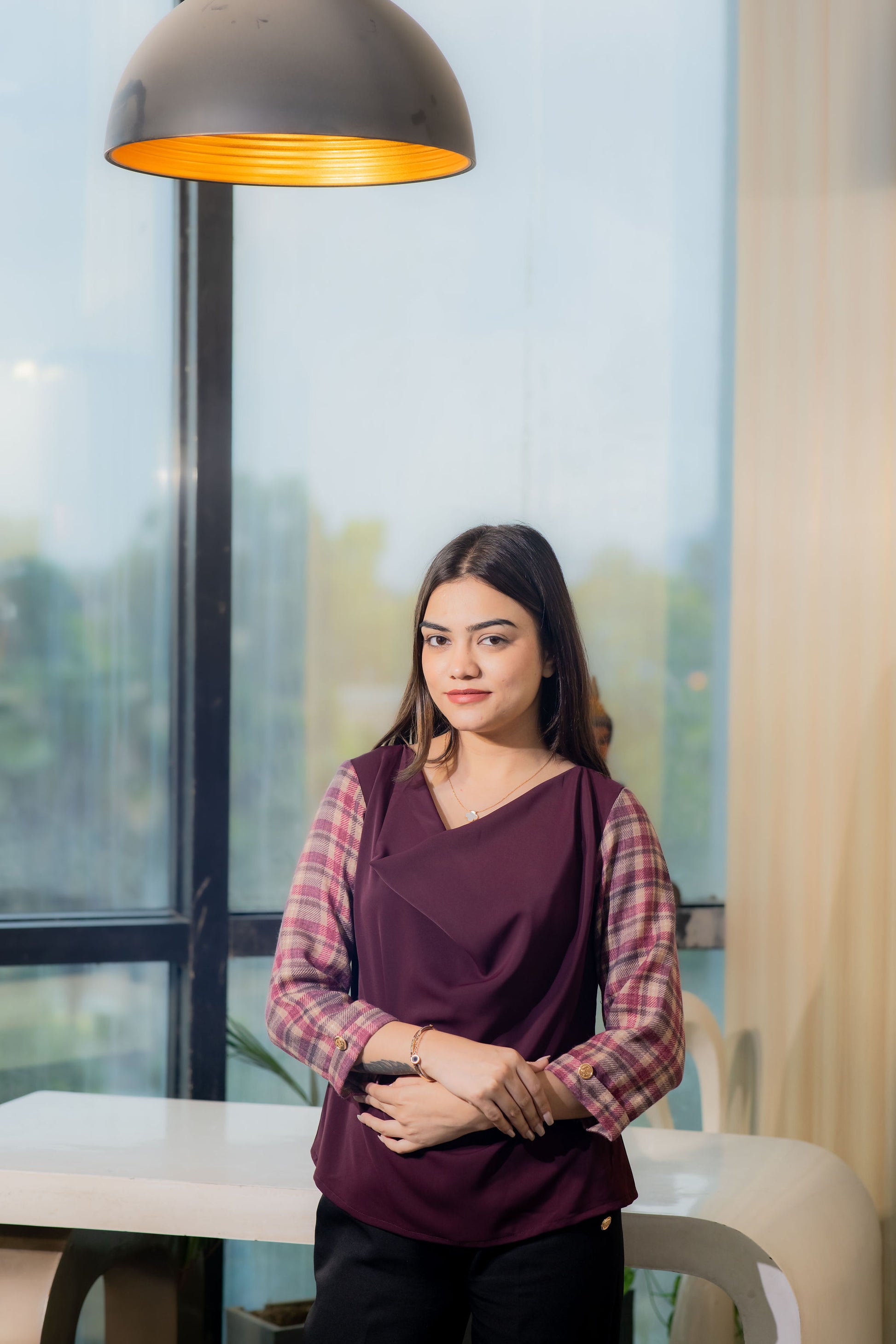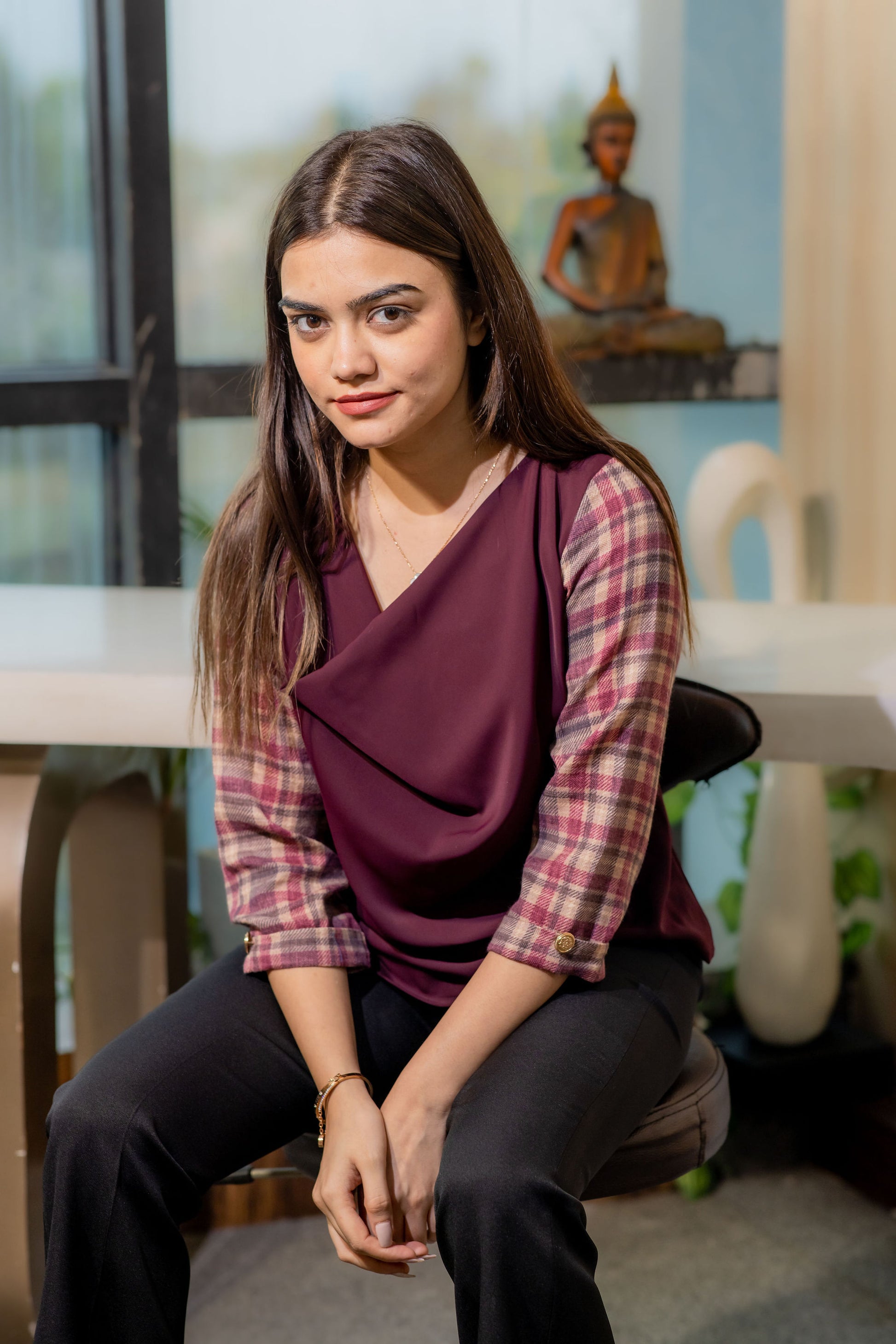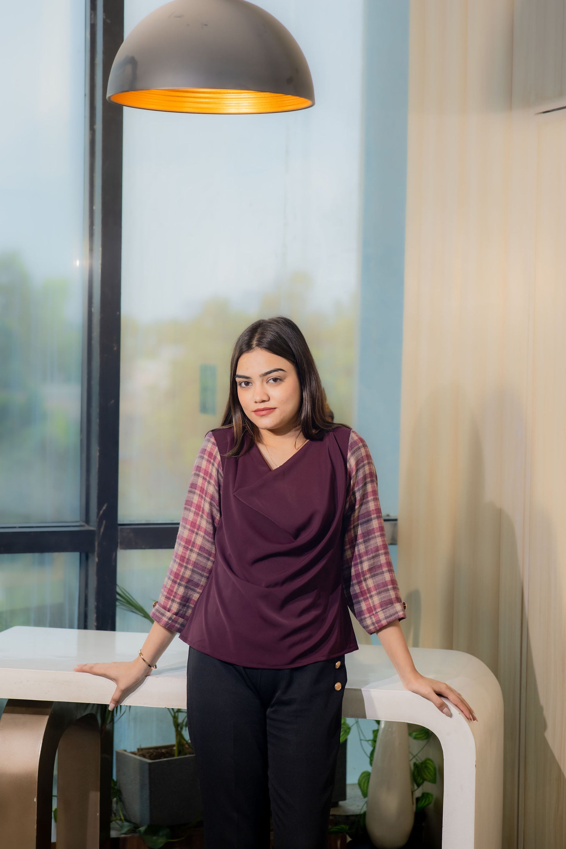 This wine cowl neck top with checkered sleeves is a striking blend of contemporary flair and timeless elegance. The rich wine color gives it an upscale vibe, while the softly draped cowl neckline provides graceful movement. The addition of statement checkered sleeves makes it an eye-catching choice for both formal and smart-casual occasions.