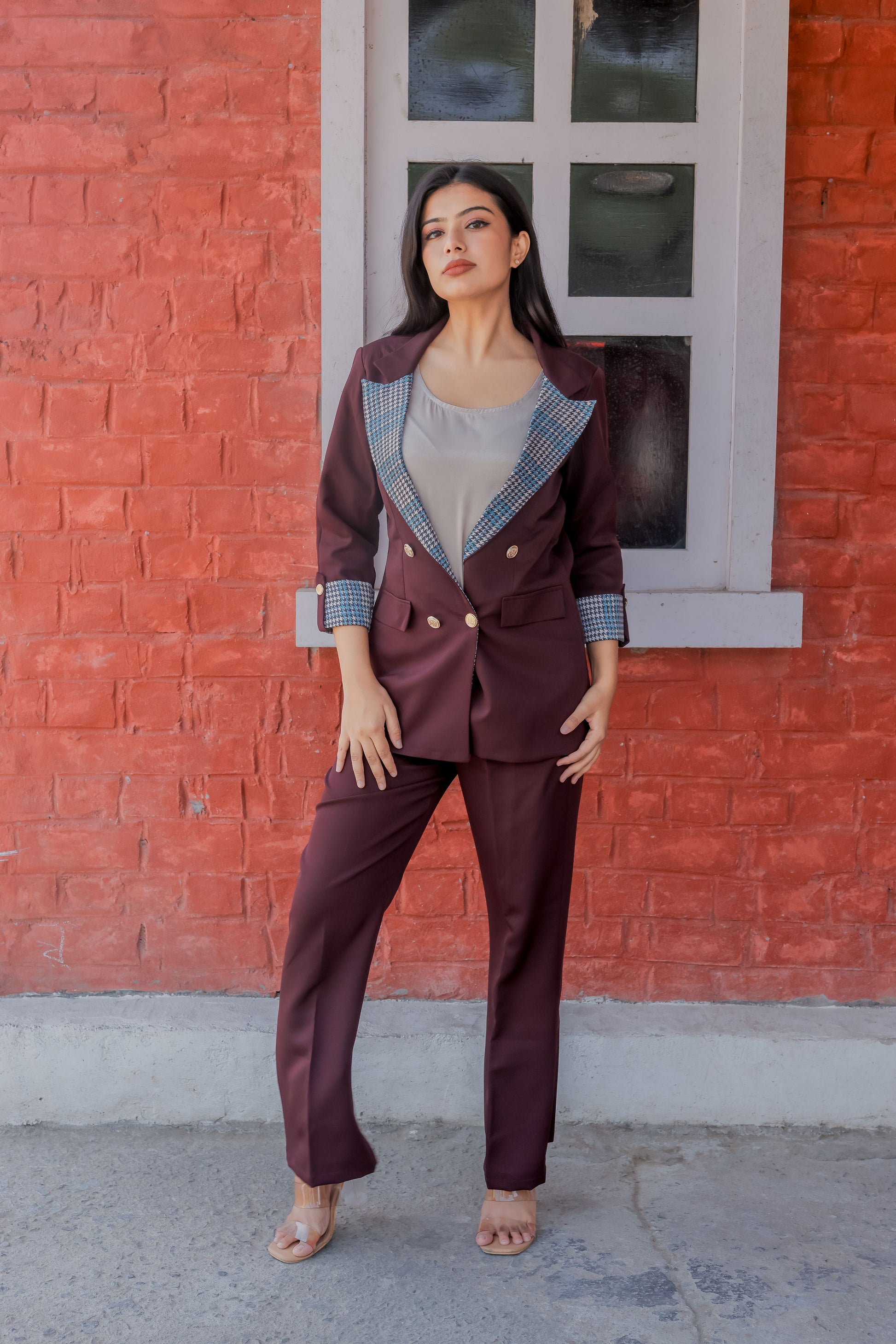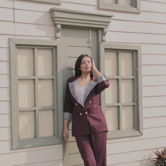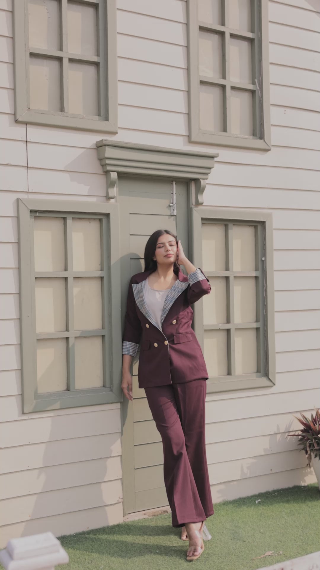 Exude elegance and confidence with our Wine Crepe Coat, a statement piece that perfectly blends sophistication with modern charm. Crafted in luxurious crepe fabric, this tailored coat features intricate houndstooth print detailing and statement gold buttons for a touch of timeless allure. The rich wine hue adds depth and refinement, making it a standout choice for both formal and elevated casual occasions.